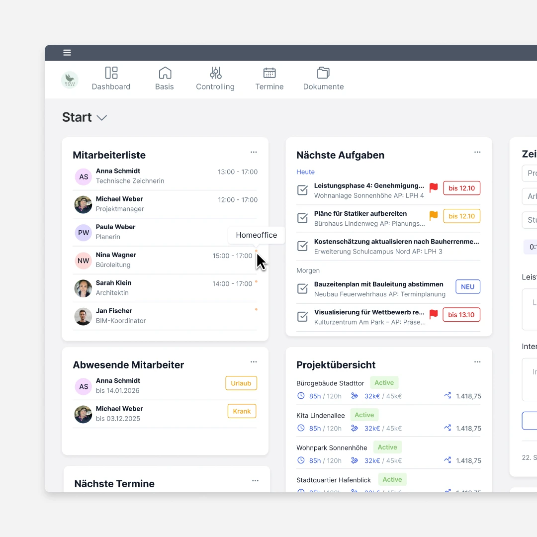 Projekte planen, Zeiten erfassen, Zahlen verstehen – mit der Software, die Architektur- und Ingenieurbüros wirklich kennt.