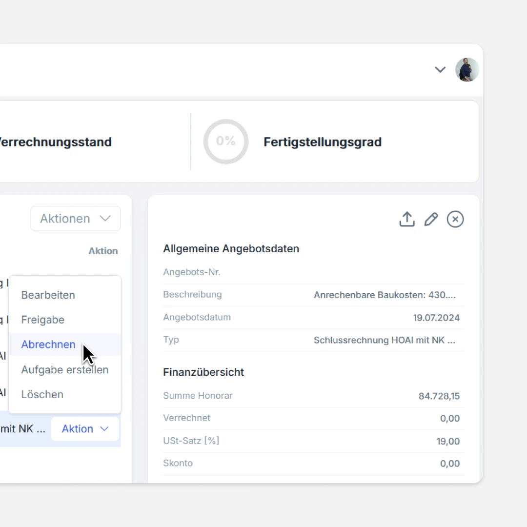 Projekt, Auftrag, Vorlage, Leistungszeitraum – vollständig oder als Teilbetrag. Rechnungsnummer automatisch, Dokument entsteht im Hintergrund. Ohne manuelles Nacharbeiten.