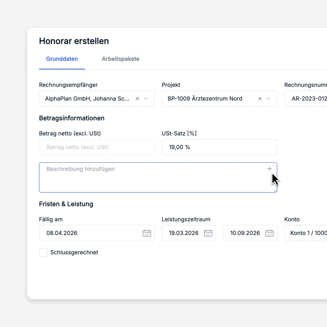 Honorarnoten anlegen. Schnell, strukturiert, vollständig.