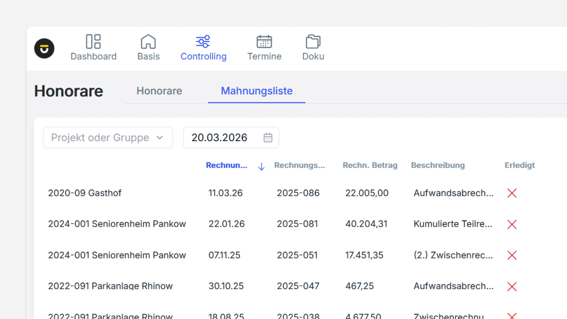 Was offen ist, was bezahlt, was gemahnt werden muss – dieser Überblick geht im Tagesgeschäft schnell verloren. Rechnungsnummern manuell, Zahlungseingänge in separaten Listen, Mahnungen per Hand. Dazu wachsender Druck durch gesetzliche Anforderungen: E-Rechnungspflicht, länderspezifische Formate. Wer Honorare nicht systematisch verwaltet, verliert nicht nur den Überblick. Er verliert Geld.
