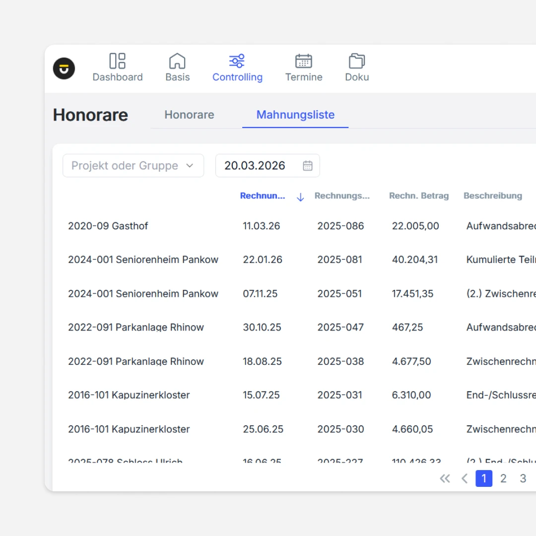 Das Honorarmodul von untermStrich gibt Planungsbüros den Überblick über gestellte und offene Honorare – von der Honorarnote bis zur E-Rechnung, von der Mahnung bis zum Export. Alles an einem Ort, direkt aus dem Projektkontext heraus.