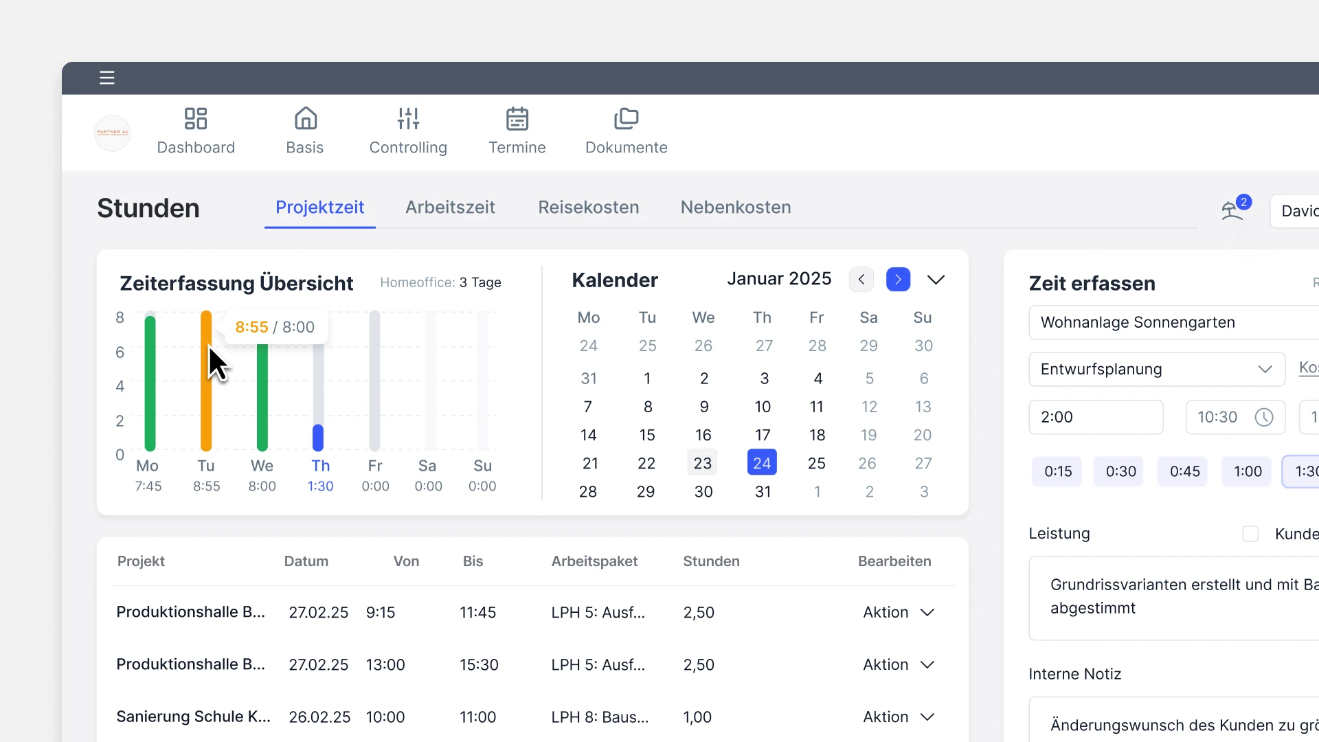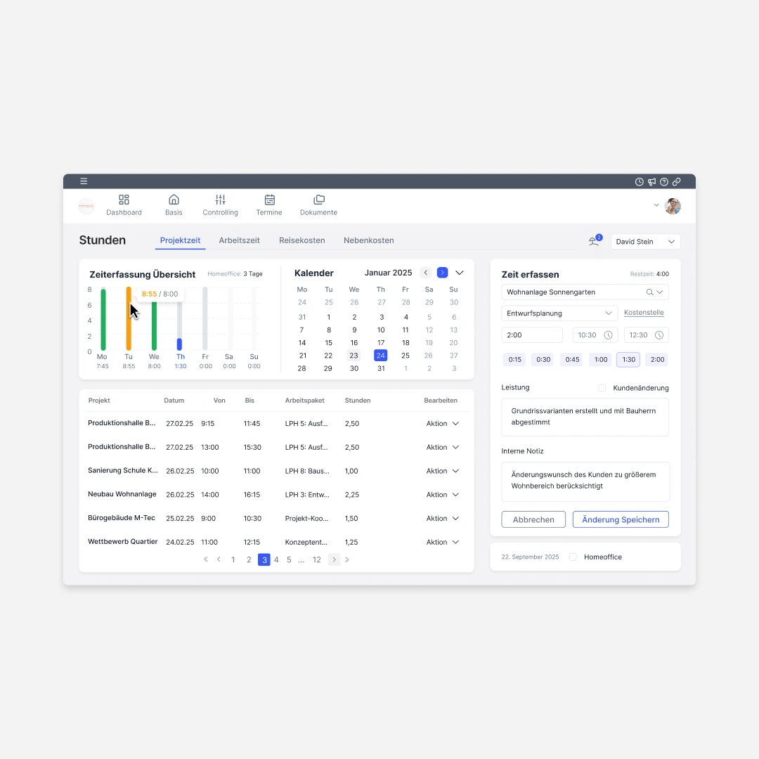 Projektbezogen, präzise nach Leistungsphasen, vollständig. Damit Auswertungen stimmen und Abrechnungen halten.