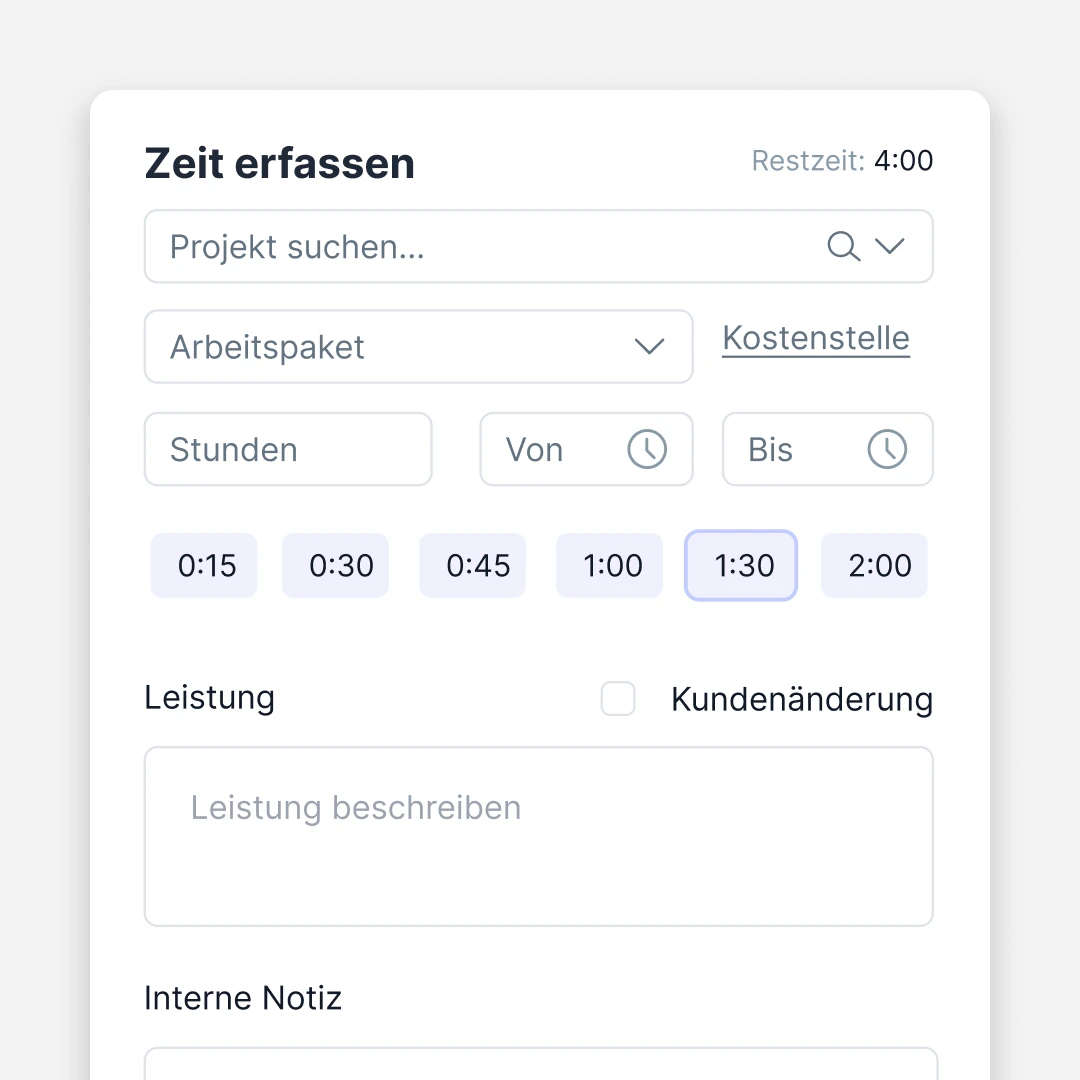 Projekt auswählen, Stunden eintragen, Arbeitspaket zuordnen – fertig. Von- und Bis-Zeiten optional, Leistungsbeschreibung ergänzbar. Erledigt in wenigen Klicks.